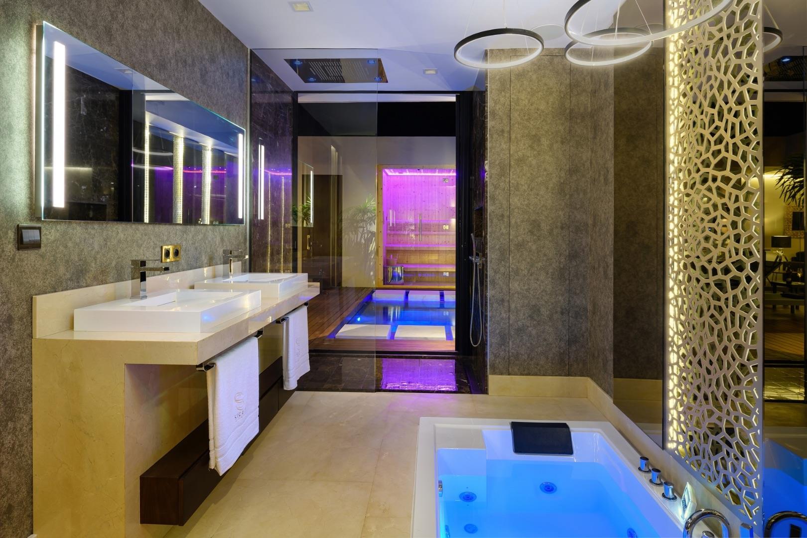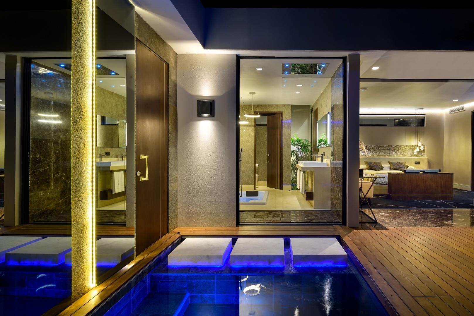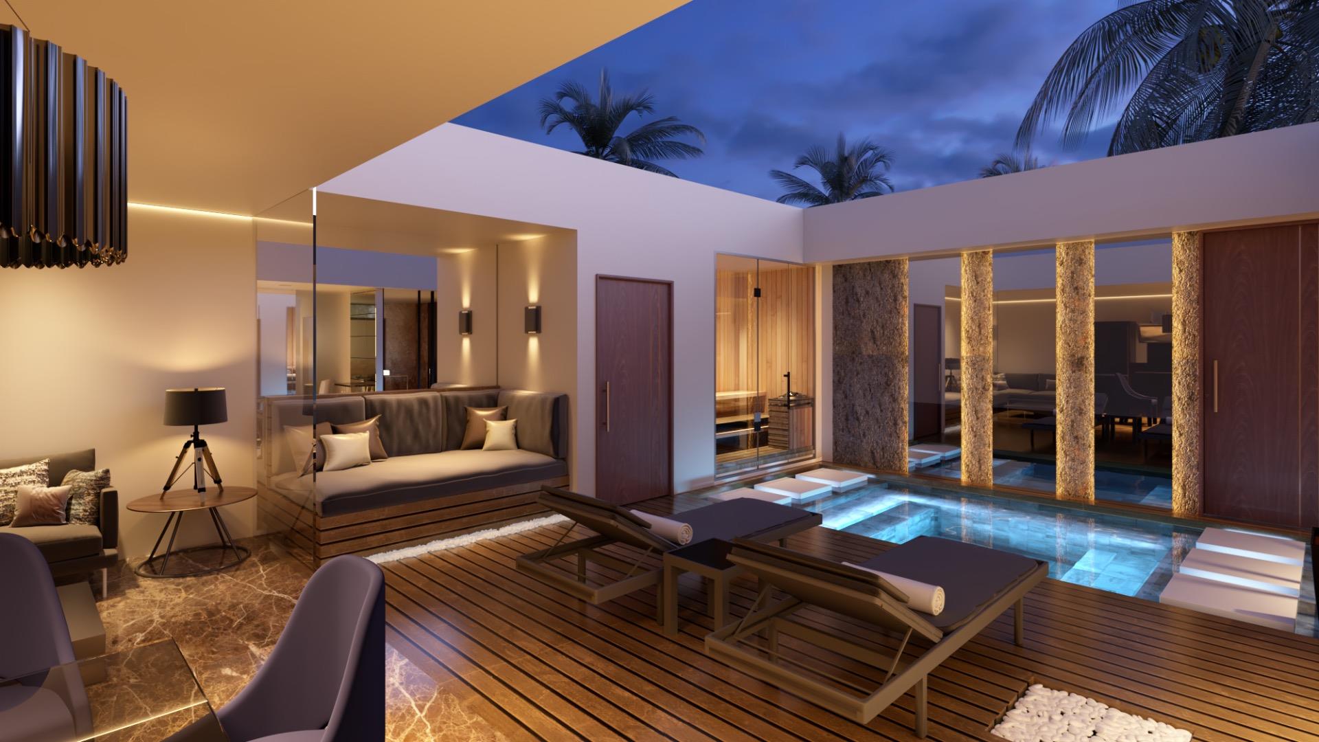 Step into your private sanctuary featuring spacious bedrooms with walk-in dressing rooms, lavish bathrooms with walk-in showers and jacuzzi tubs that open directly onto your heated natural-stone pool. Your exterior sauna overlooks this private aquatic haven, while glass-roofed corridors ensure weather-protected luxury throughout the resort.