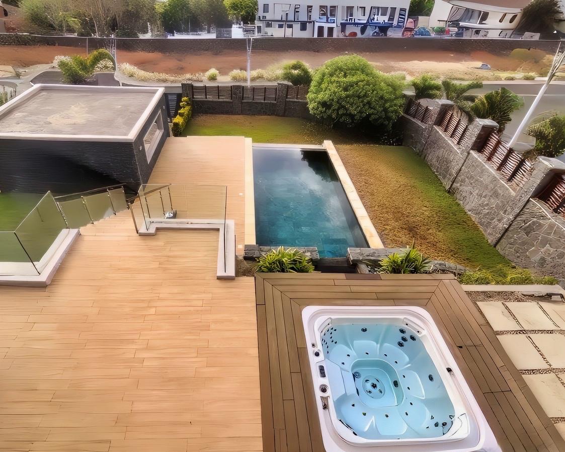 The Villa's outdoor spaces are a private sanctuary designed for ultimate relaxation and grand entertainment, offering a sensory experience of unparalleled leisure. The expansive ground floor terrace, adorned with elegant architectural wooden blinds for both privacy and adjustable shade, hosts a spectacular 7-seater integrated JACUZZI. From this luxurious vantage point, residents are invited to indulge in breathtaking panoramic views over the endless horizon, perfectly positioned to provide a front-row seat to nature's most spectacular display: the legendary Mauritian sunsets. Adding a touch of dramatic elegance and serenity, a cascading WATERFALL feature flows gracefully from the ground floor level into the meticulously tiled horizon-edge INFINITY SWIMMING POOL, measuring an inviting 8 x 3.5 meters. The upper balcony provides yet another splendid outdoor retreat, complete with AUTOMATED electrical awnings that offer adjustable shade and comfort, redefining alfresco living and ensuring optimal enjoyment of the tropical climate at any hour of the day.