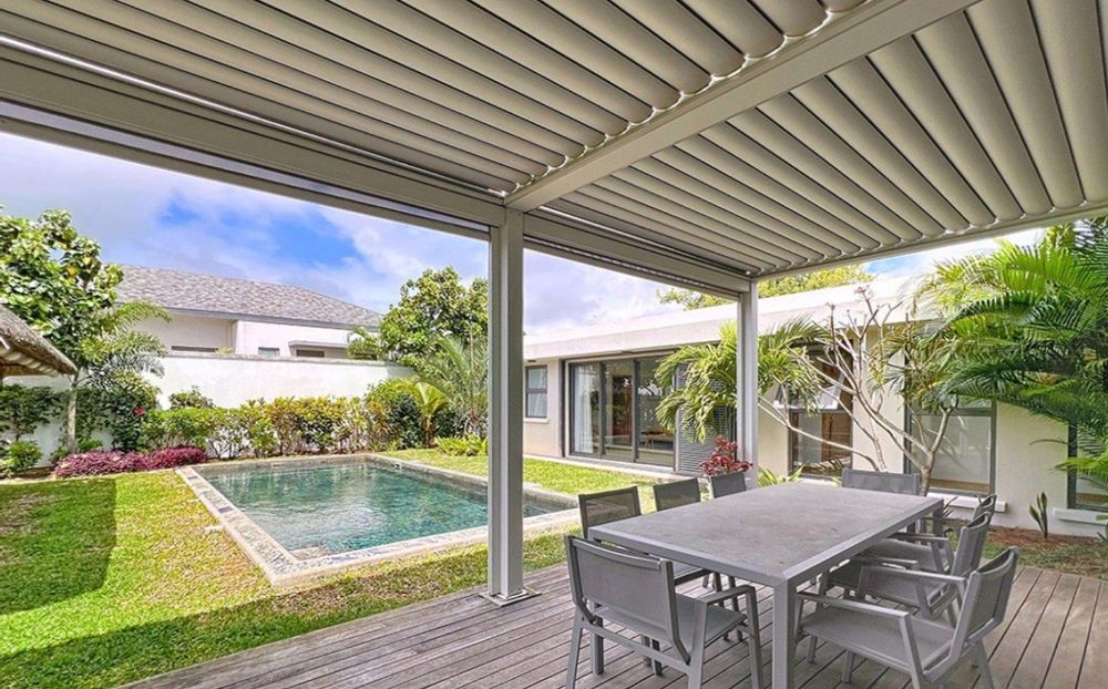 Step outside to your private sanctuary, where a striking slate pool takes center stage. An elegant pergola-covered terrace and furnished gazebo create multiple spaces for alfresco dining and relaxation, perfect for embracing the island's enviable climate year-round. The outdoor shower adds a touch of resort-style luxury to your daily routine.