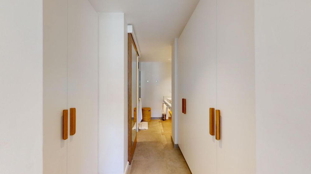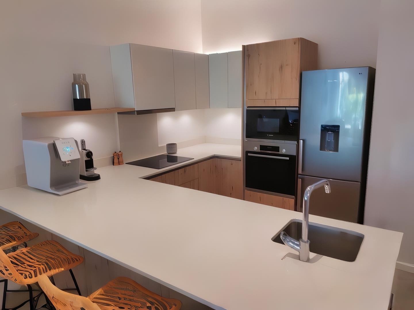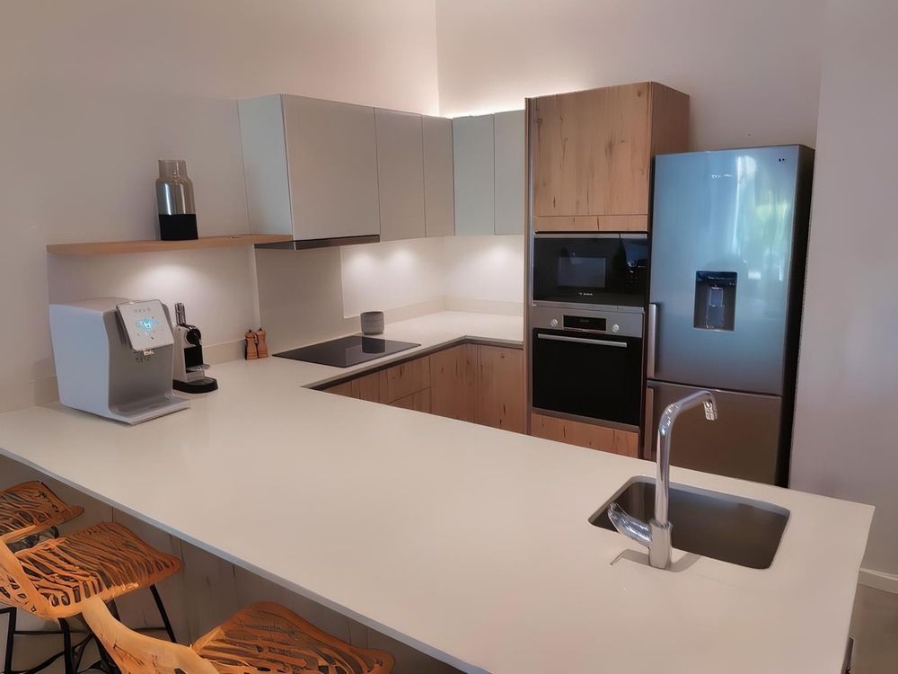 Inside, you'll find a thoughtfully designed open-plan kitchen, dining, and living area that exudes style and comfort. The space is surprisingly expansive, providing a cozy yet luxurious atmosphere. The living room is equipped with air conditioning, ensuring year-round comfort, and seamlessly connects to a separate scullery that offers additional storage and functionality. The unit features two large bedrooms, each with ample closet space—an uncommon feature that adds to the convenience and practicality of the apartment. The main bedroom enjoys a peaceful outlook over the communal pool and includes a private ensuite bathroom.
