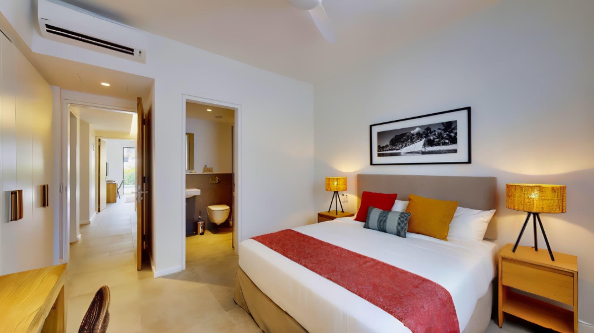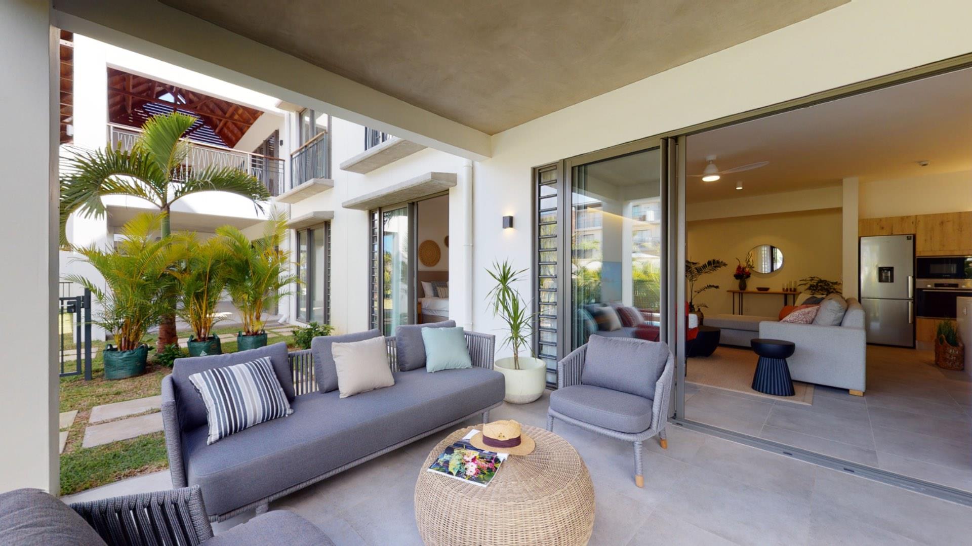 A covered veranda extends from the main living area, creating a perfect outdoor space to enjoy Mauritius' tropical climate while overlooking the inviting pool. While currently furnished, the apartment will be sold unfurnished, allowing new owners to personalize the space to their taste. The ground-floor location provides easy access, making day-to-day living effortless, and the property includes a designated open parking spot for residents.