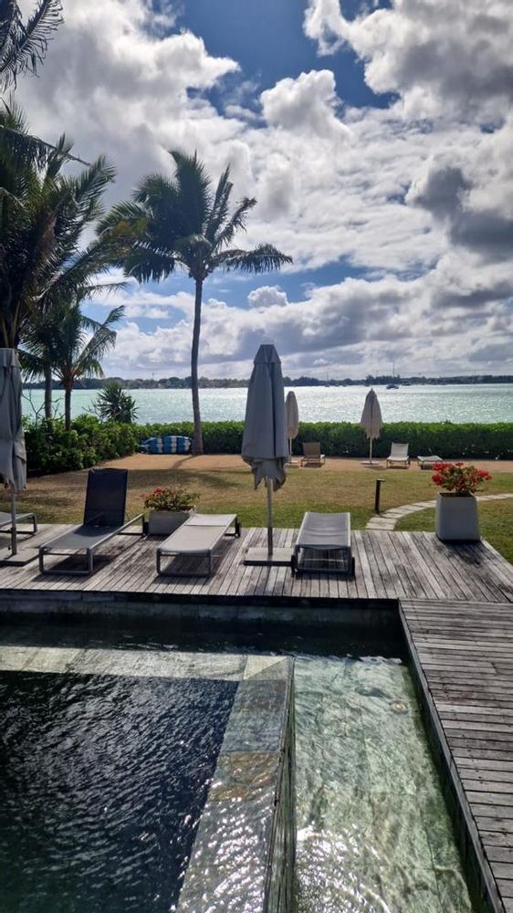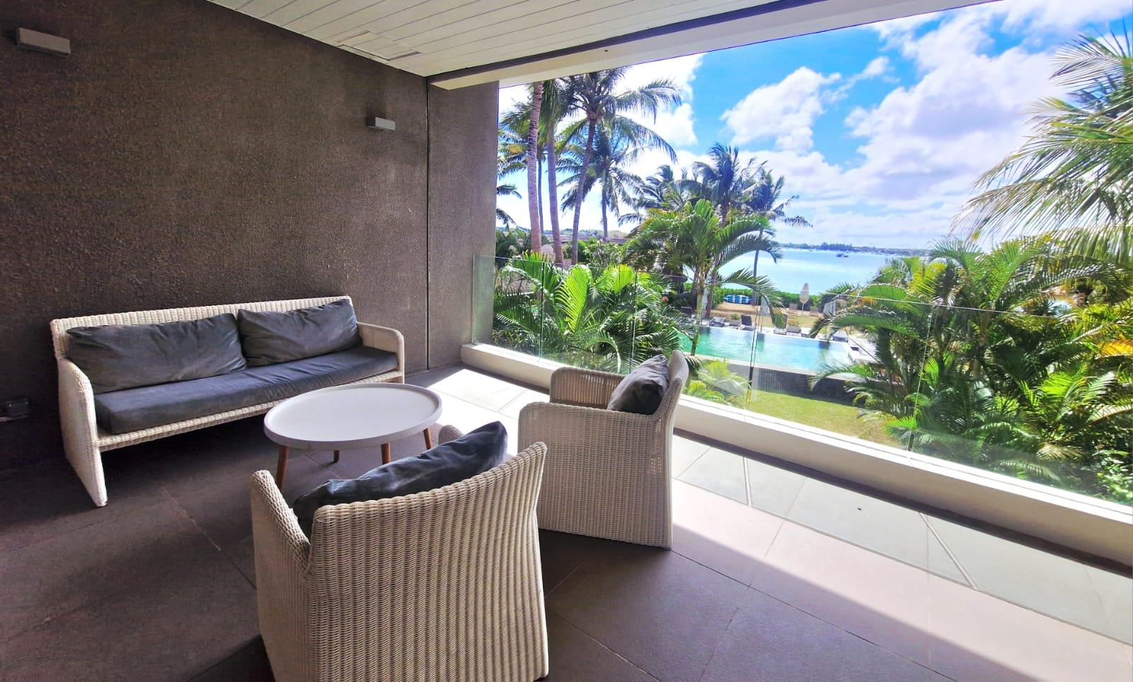 Discover this bright and elegant first-floor apartment overlooking the ocean, ideally located in the exclusive Rive Bleue residence in Pointe aux Canonniers.