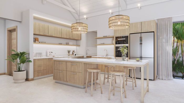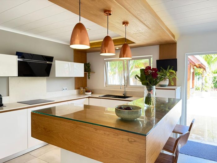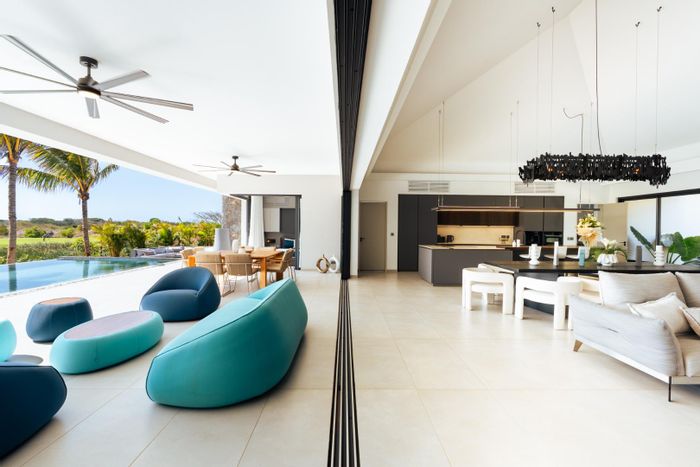 Island living minutes from Grand Baie’s beaches and golf, this contemporary villa offers open-plan entertaining with a modern kitchen, private slate pool and pergola terrace — three bedrooms, two bathrooms.