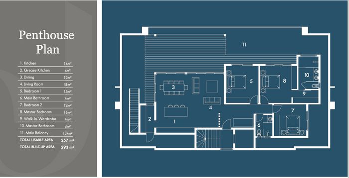 Island living redefined in Grand Bay: private lift to a 3‑bed penthouse with rooftop entertaining and sea views, retractable roof blinds, plus private beach access.