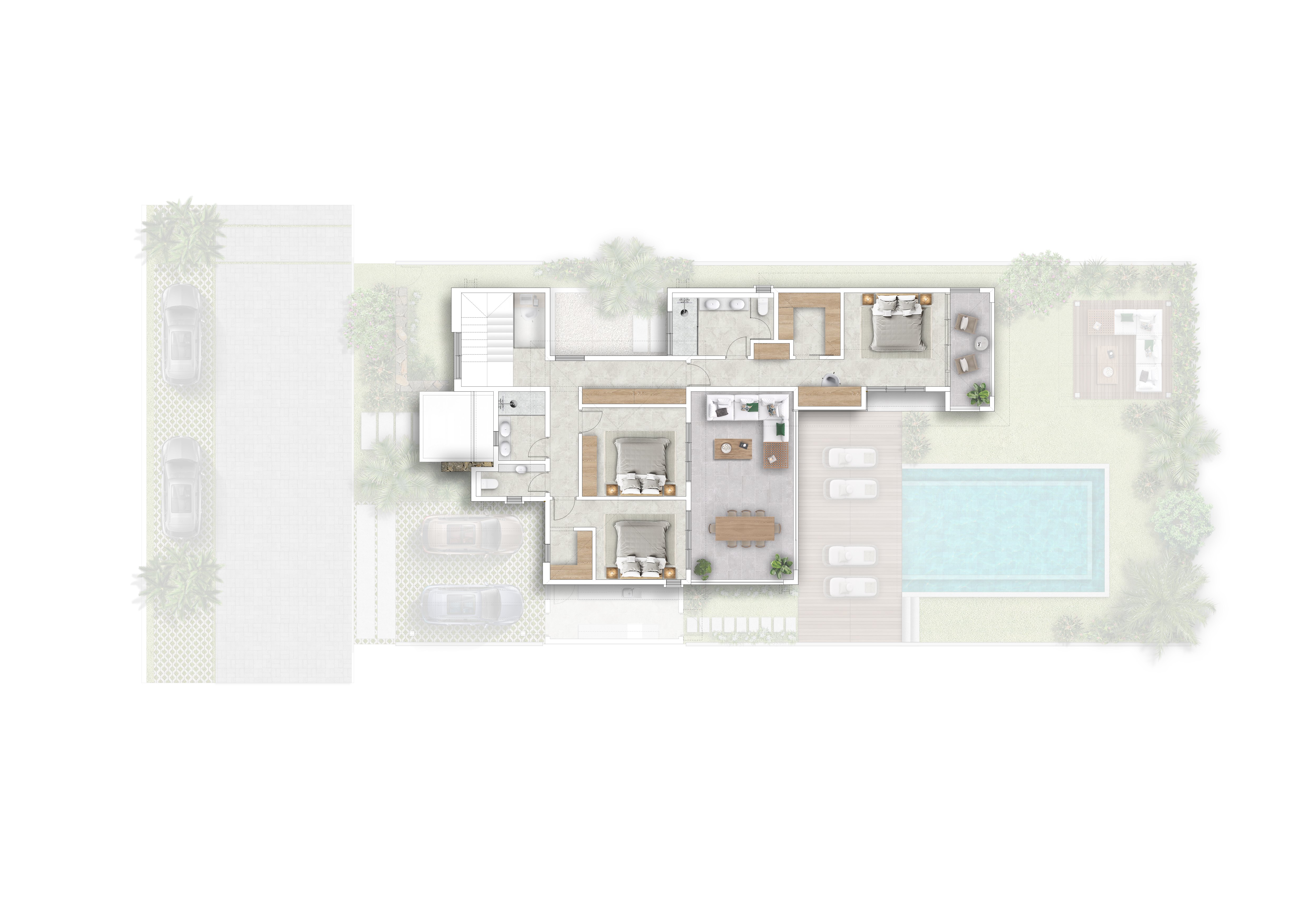 Experience effortless indoor-outdoor living across two thoughtfully designed levels. Each four-bedroom sanctuary features seamless flow between interior comfort and tropical tranquility, complete with your private swimming pool and charming cozy kiosk – perfect for morning coffee rituals or sunset cocktails in your own garden oasis.